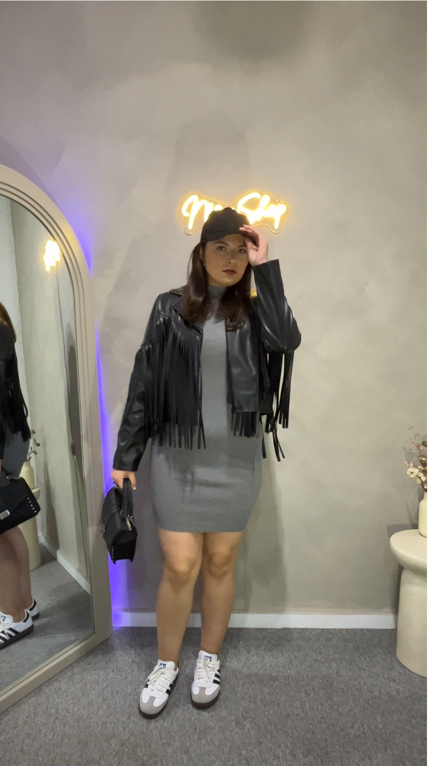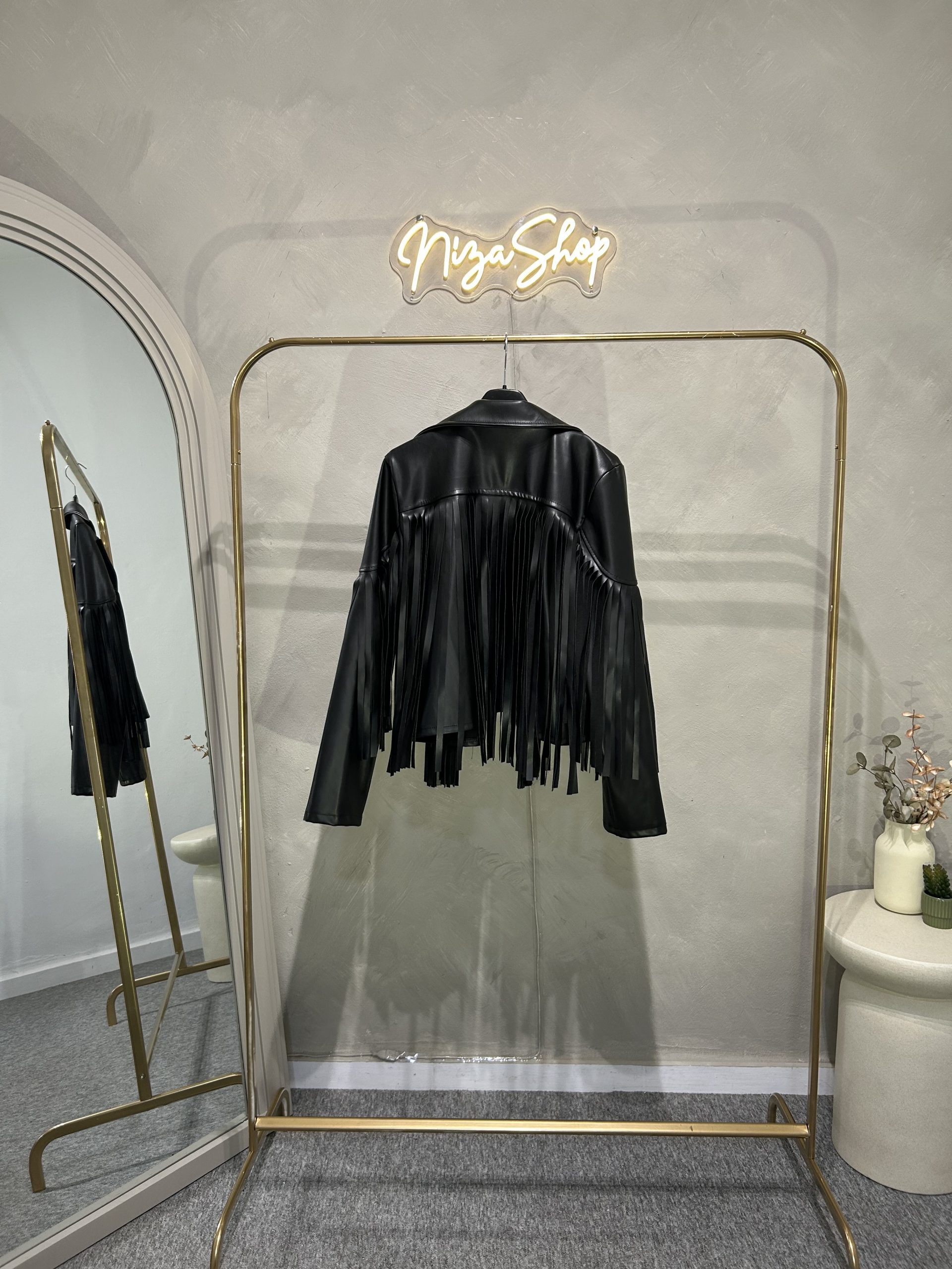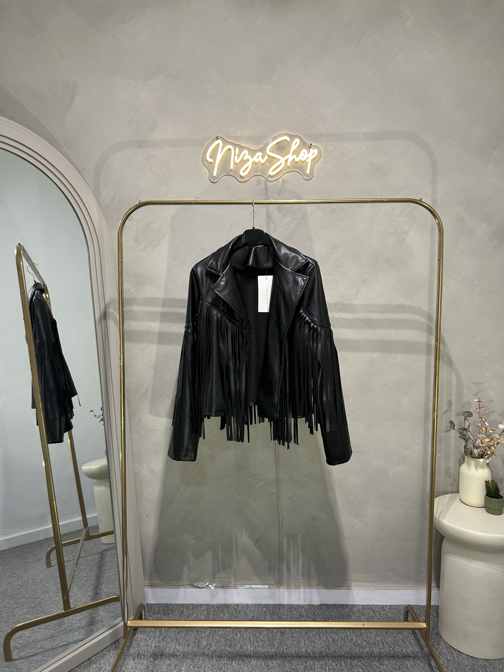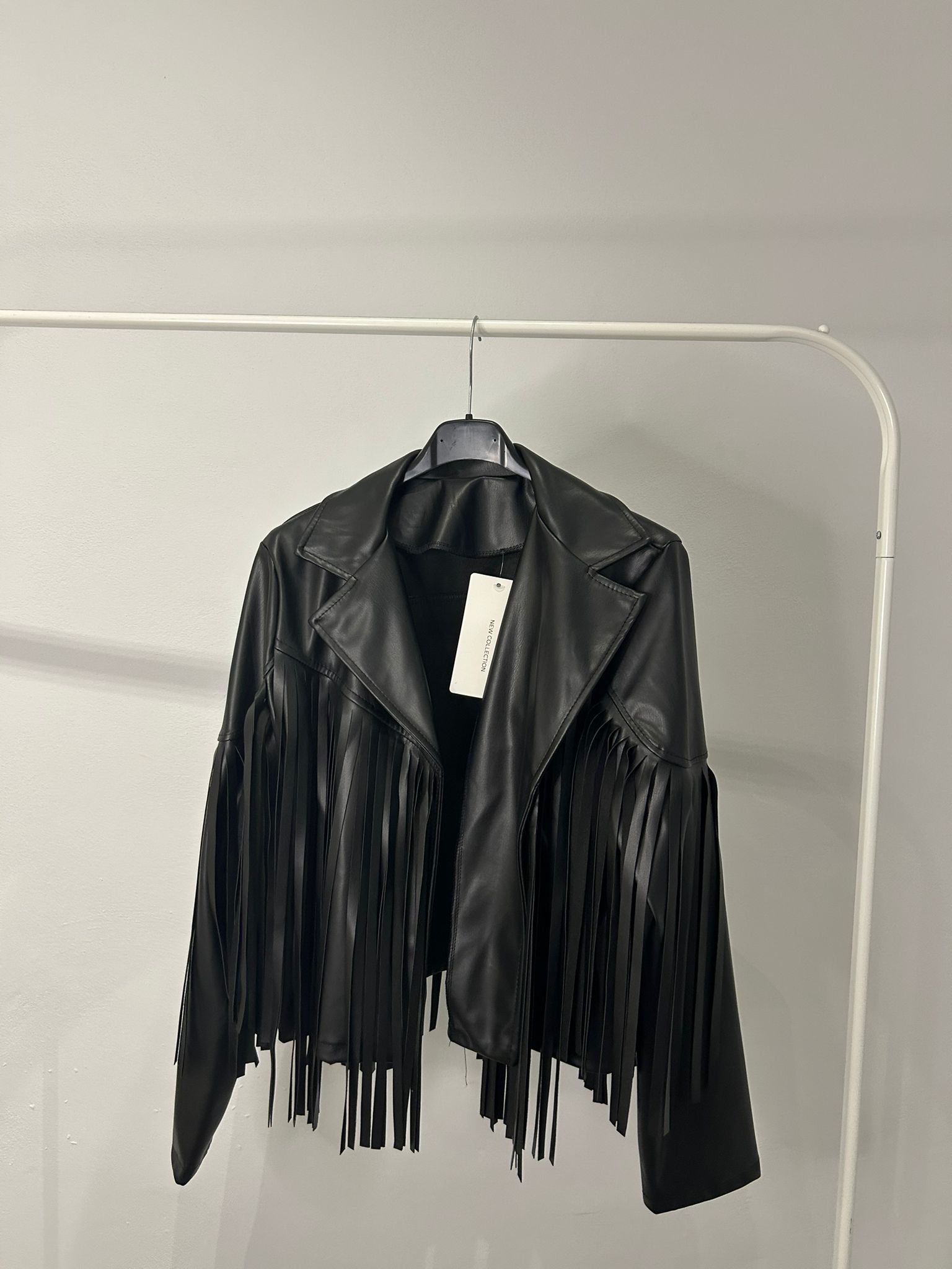 Chaqueta negra de piel con flecos. Estilo único, elegante y con carácter. Perfecta para dar un toque rockero o boho a tu outfit.