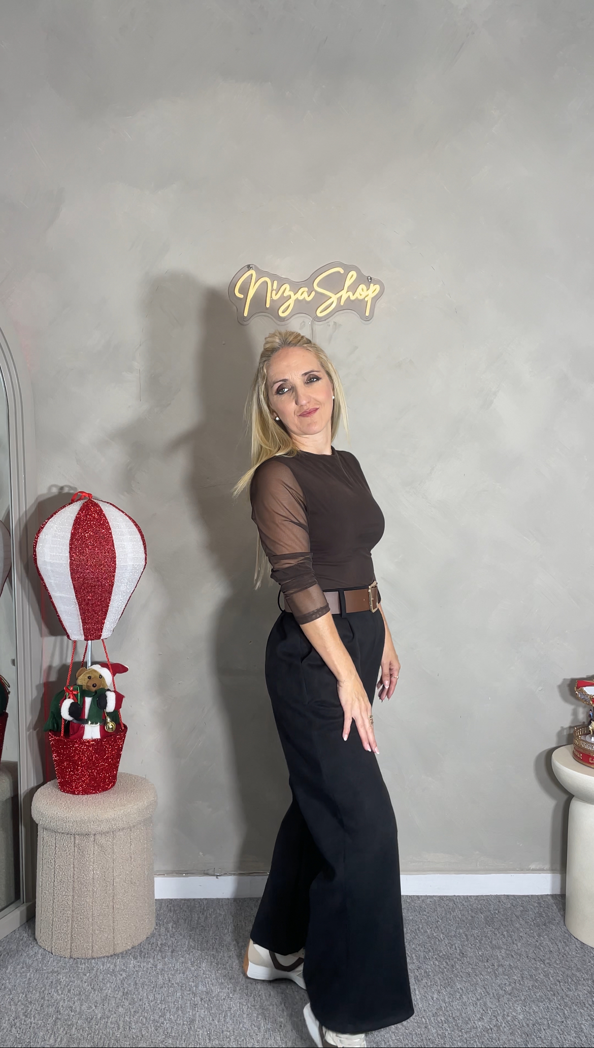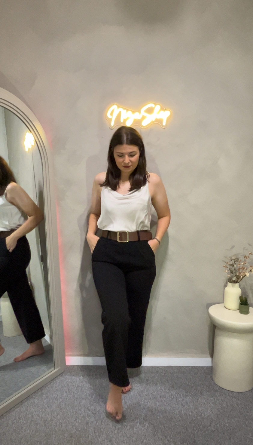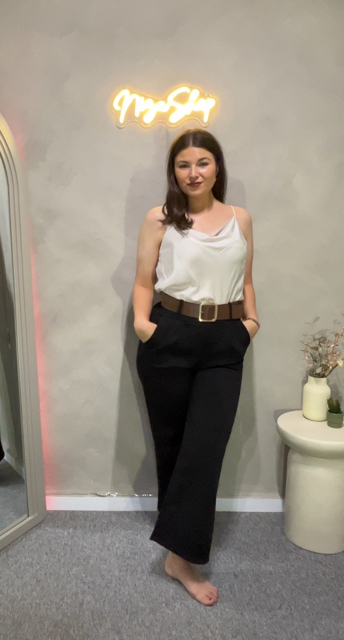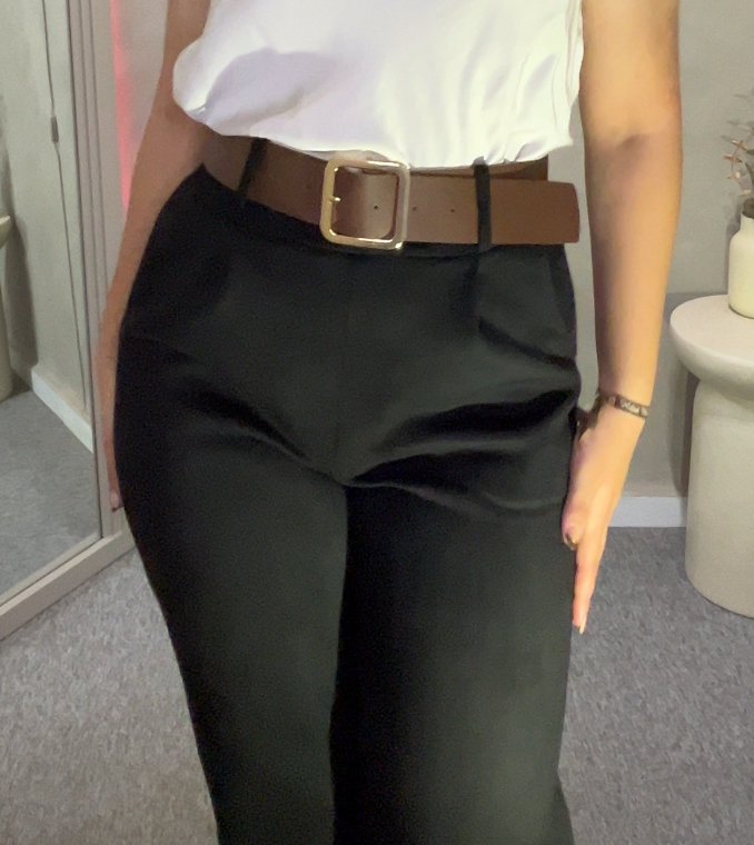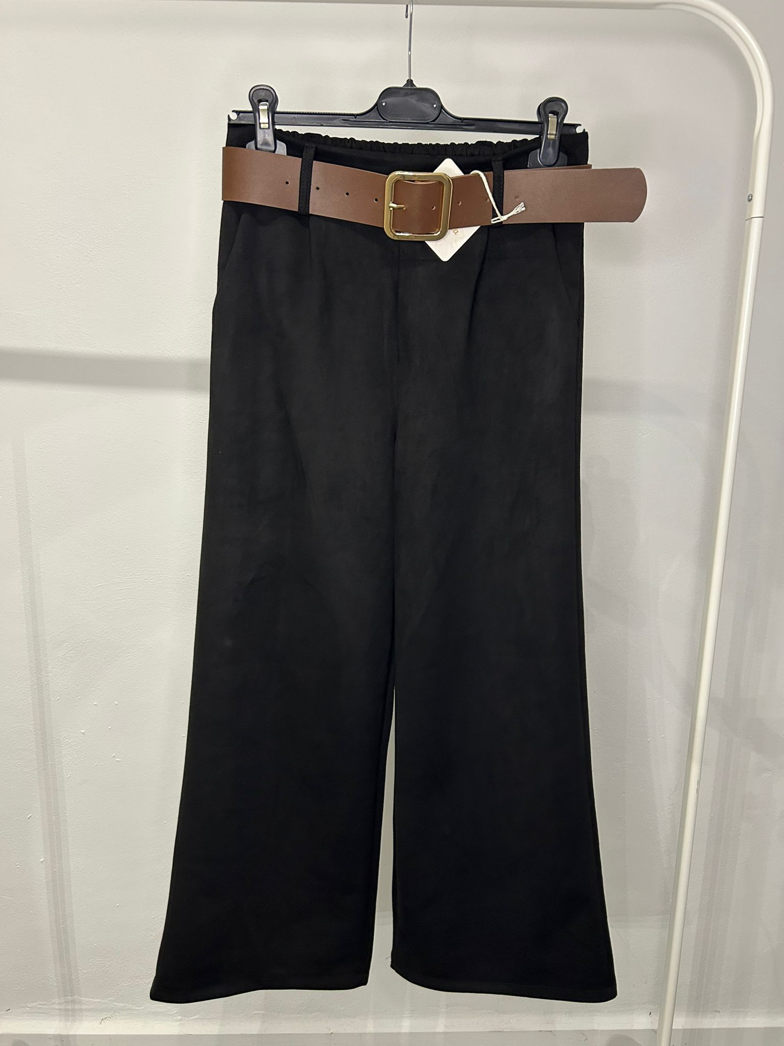 Pantalón palazzo de antelina color negro con cinturón ancho color marrón