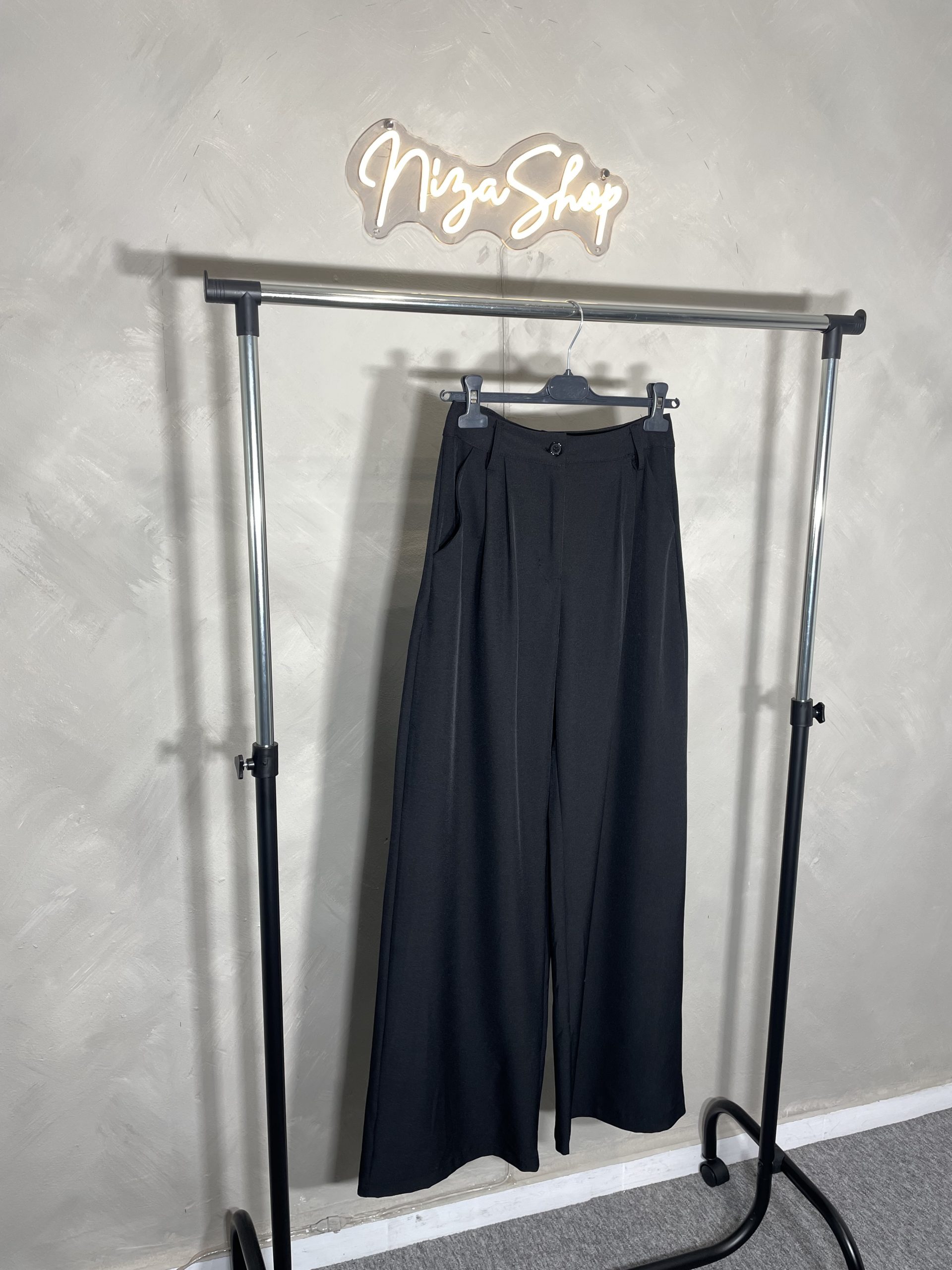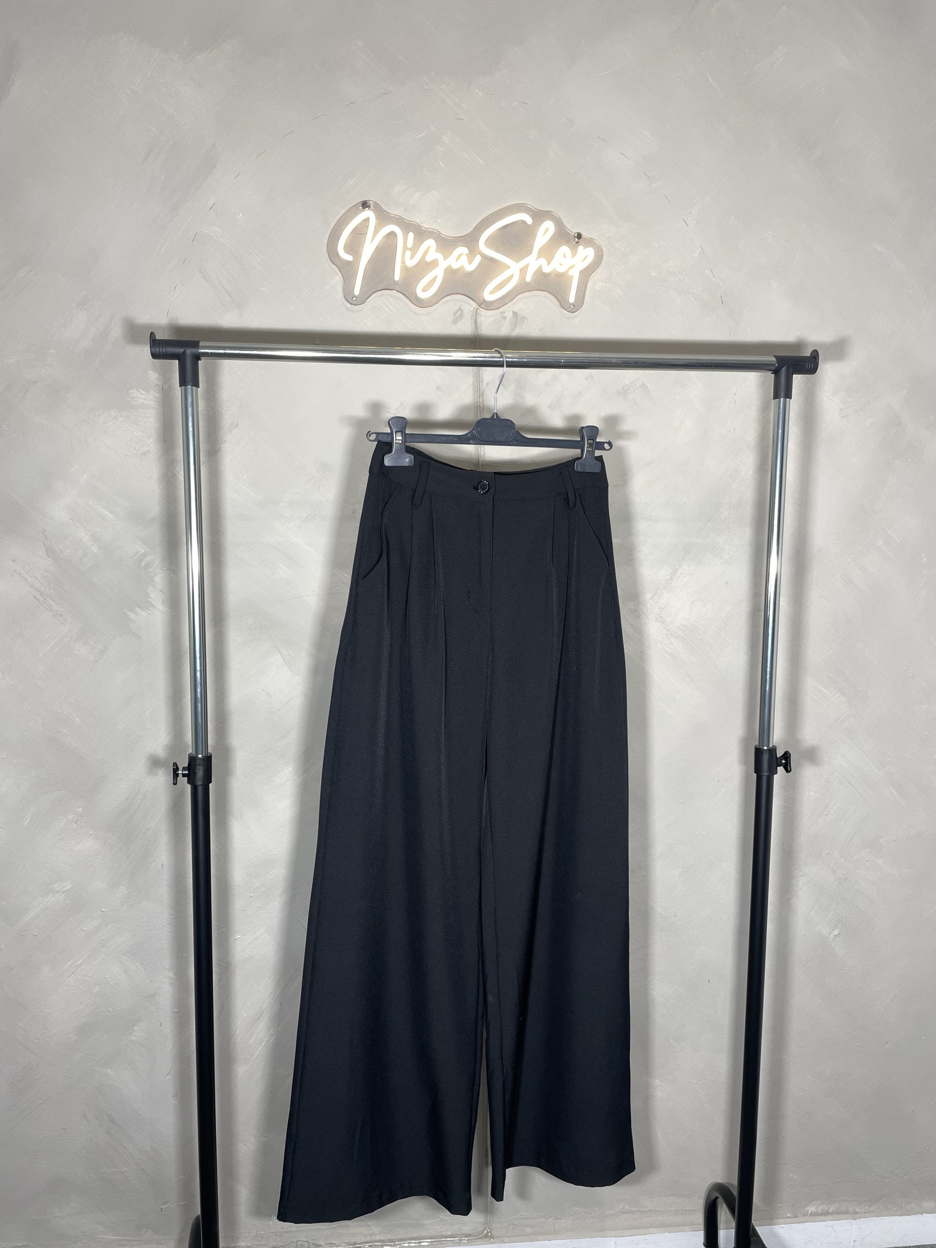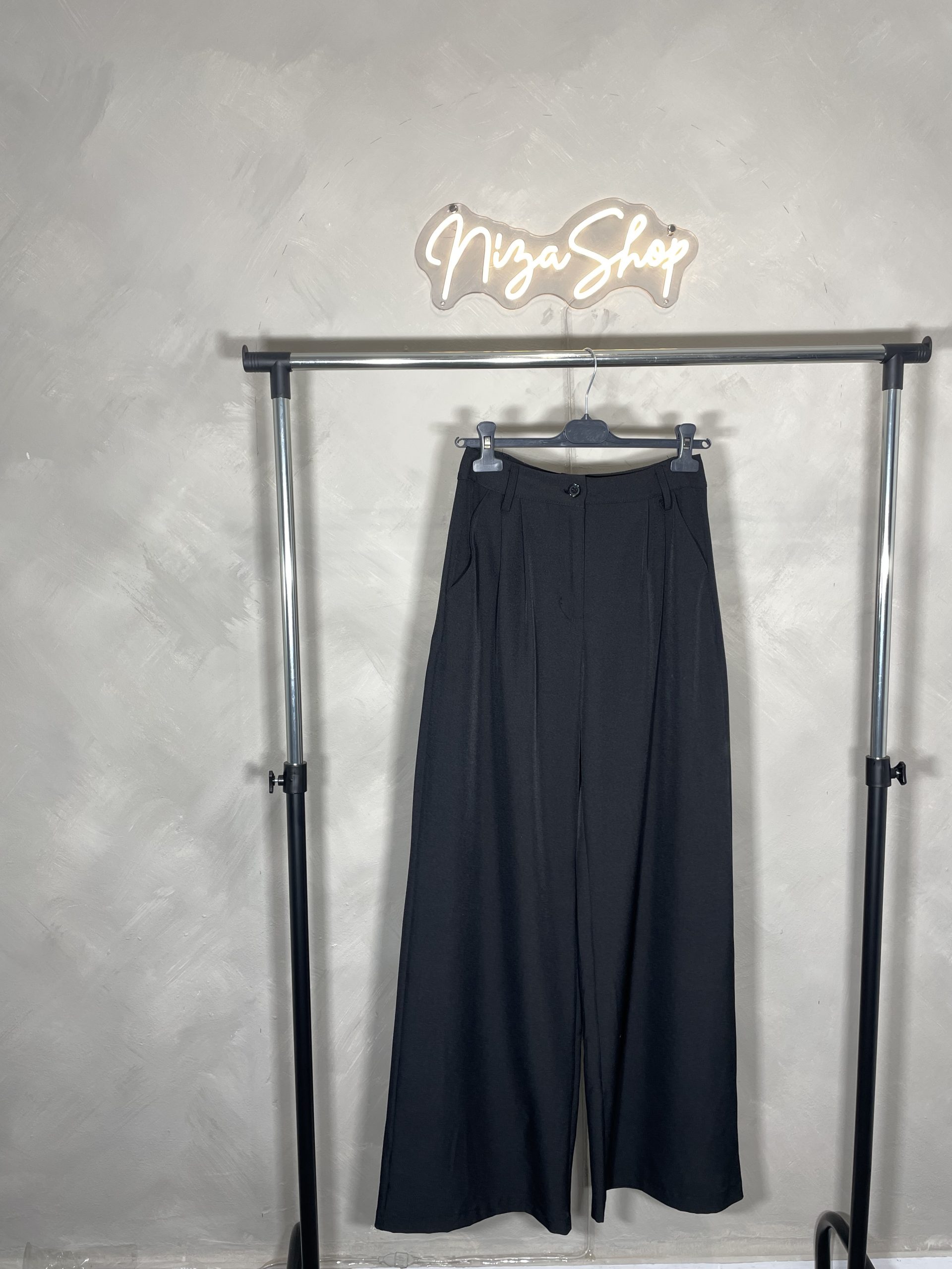 Pantalón de vestir negro de mujer con cintura alta, tela fluida y pata ancha