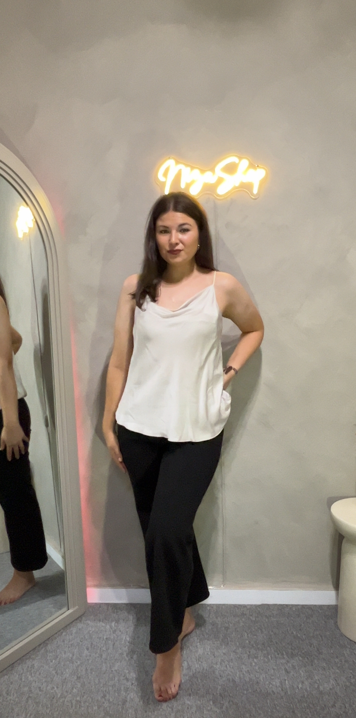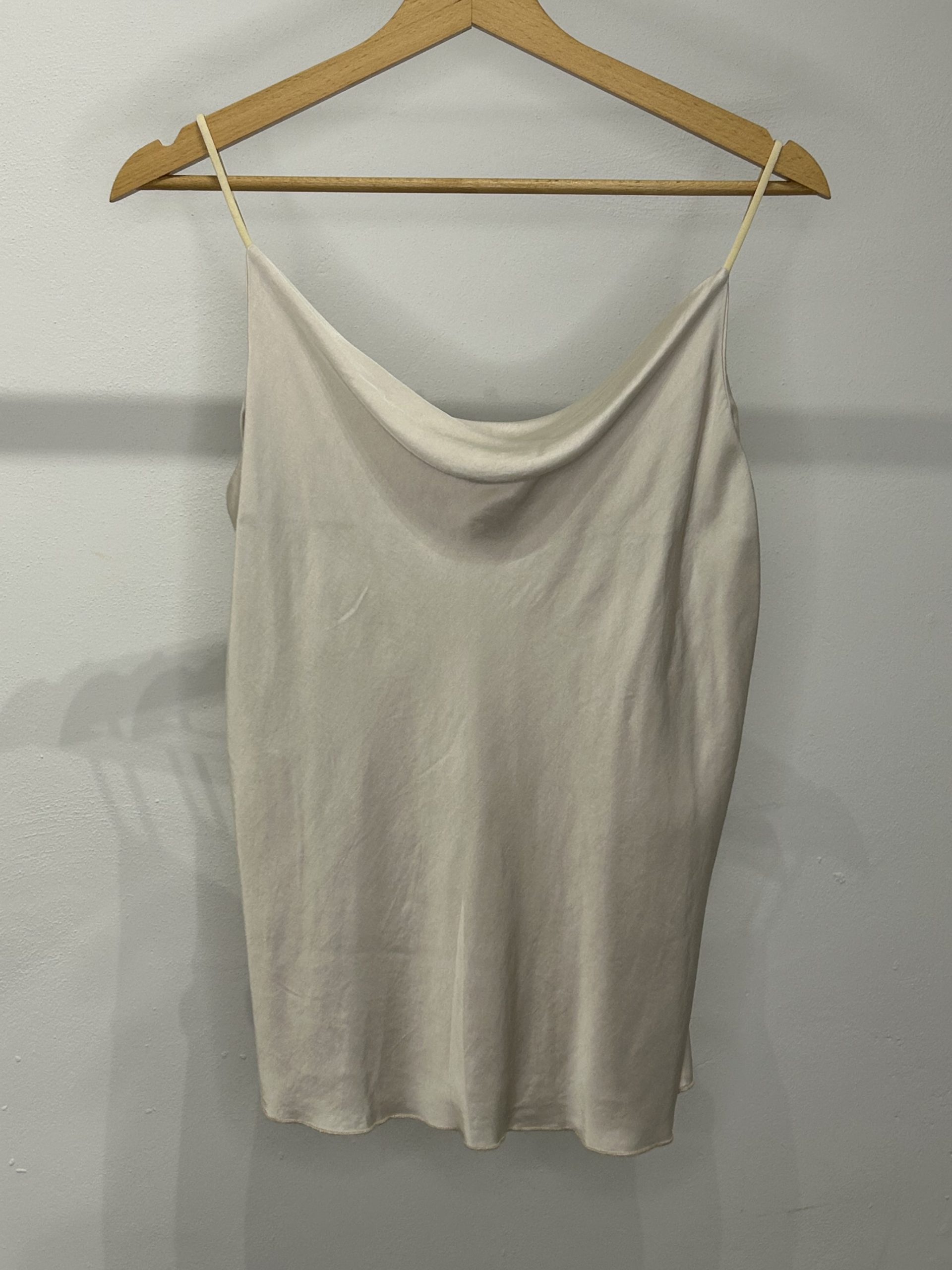 Top lencero satinado color beige claro con escote drapeado o cowl y tirantes finos